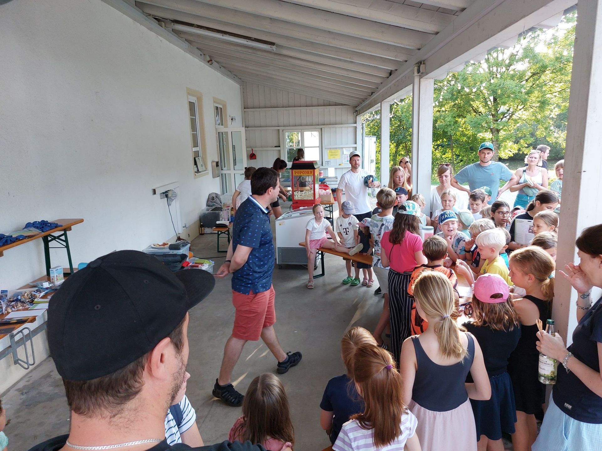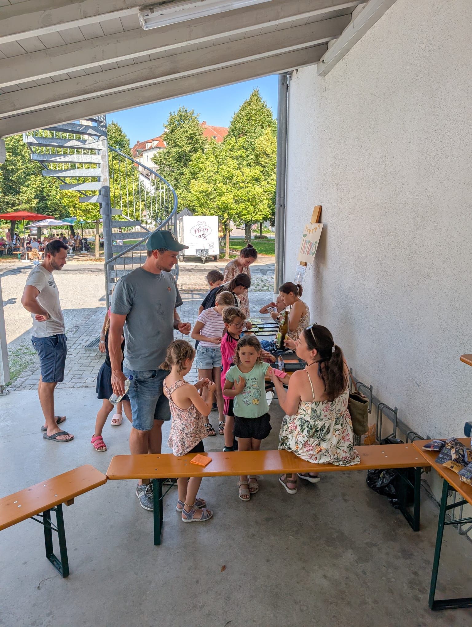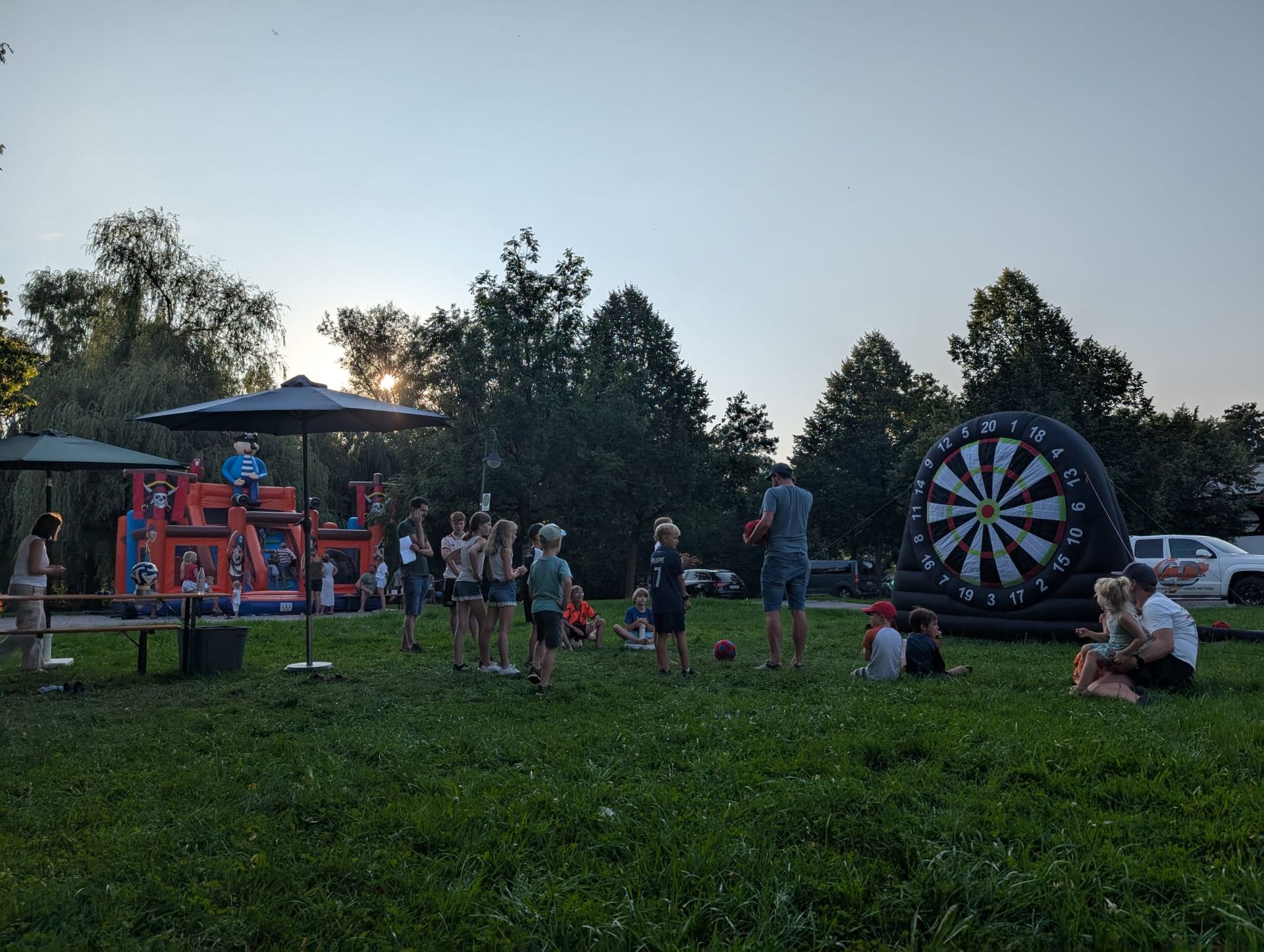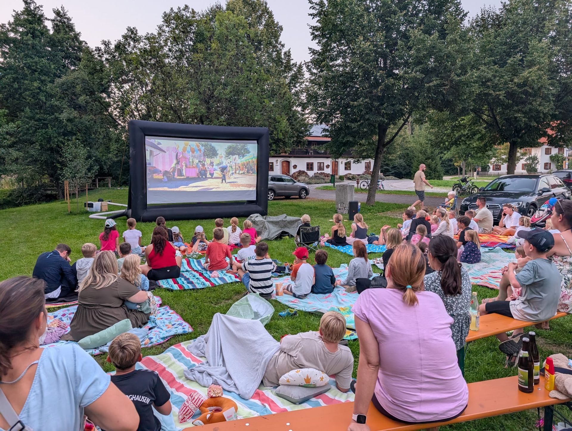 Als es langsam dunkel wurde, kam ein weiteres Highlight: Eine große Kinoleinwand wurde aufgebaut, und die Kinder konnten unter freiem Himmel einen Film anschauen – bei warmem Sommerwetter. Ein richtig schöner Abend!